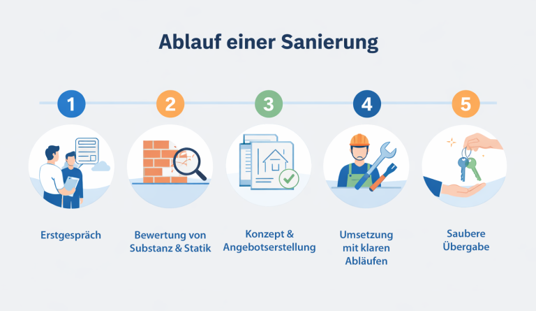 Die Kosten hängen stark vom Zustand des Gebäudes, dem Umfang der Maßnahmen und den gewünschten Ausstattungsstandards ab. Nach einer Bestandsaufnahme erhalten Sie von uns ein transparentes und nachvollziehbares Angebot. Unser Ziel ist eine realistische Kalkulation ohne unangenehme Überraschungen.